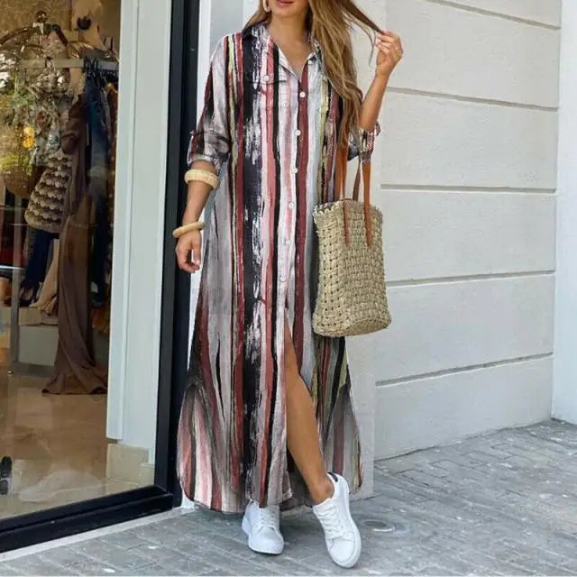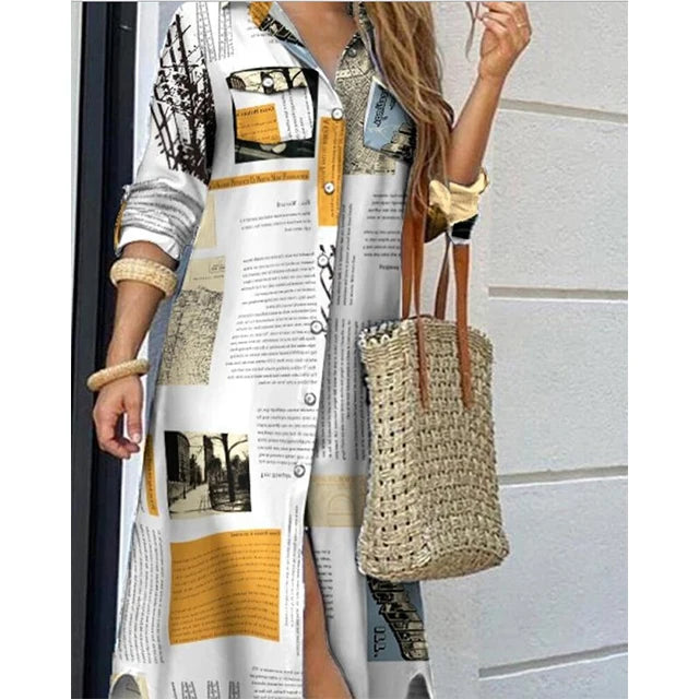 FLONIFY Long Dress Long Sleeve Shirt Dress Women Denim Long Dresses Pocket Button Shirt Print Dress Casual Loose Dresses 2025