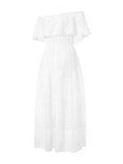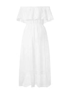 FLONIFY Casual Dress, Off Shoulder Short Sleeve Middle Waist Lace Embroidered Solid Color Irregular Dresses